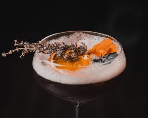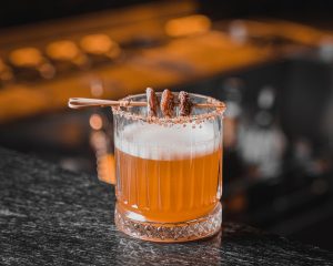 Son Tinh Mo Rice Wine, Passionfruit Syrup, Vanila Syrup, Amaretto, Lime Juice, Ginger Juice, Dry Plum and Salt Rim